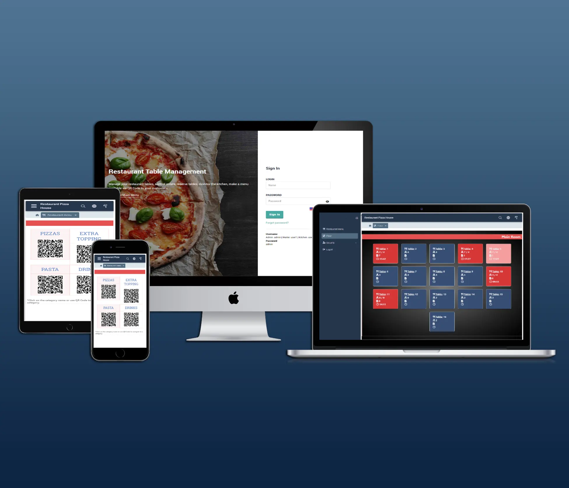 - Manage your restaurant tables, check orders, reserve tables, monitor the kitchen, make a menu available in QR Code for your customers.